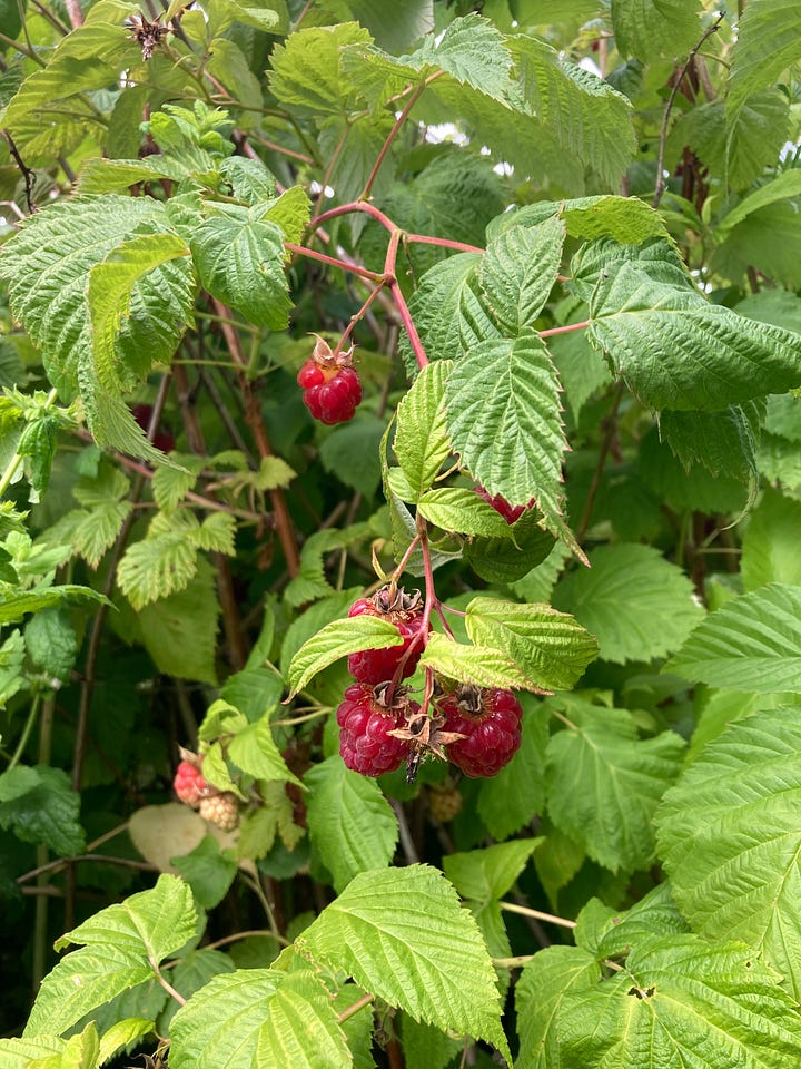 The Raspberries have not been cleaned out since I planted these canes three years ago and they are prolific, way too crowded and delicious as ever. This fall I swear I will give them their proper!