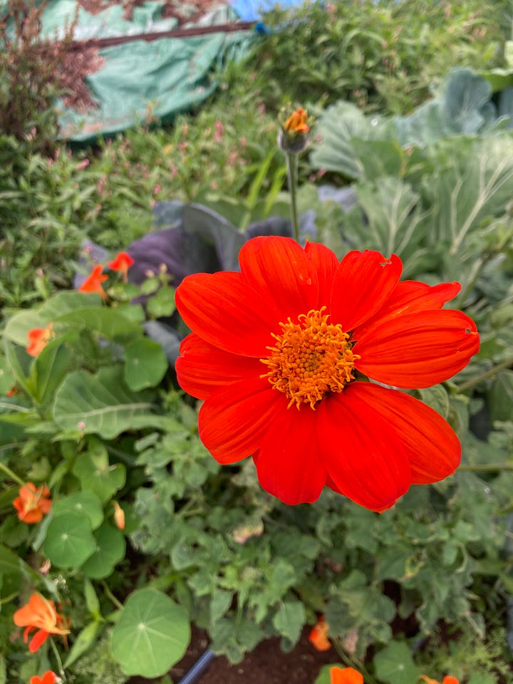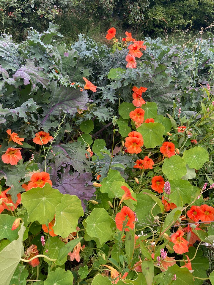 There is an unruly vase of flowers that are mostly oranges and yellow - Yarrow, Feverfew, Tithonia and Nasturtiums. We made our dream come true and now the Nasturtiums are trailing over the garden bed edges.